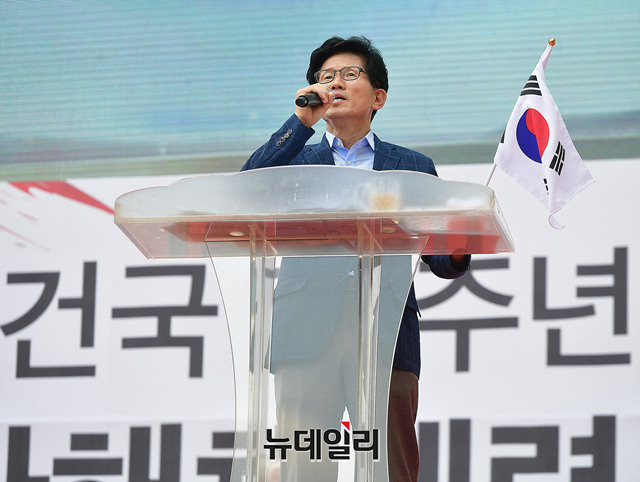 김문수 전 경기지사가 15일 오후 서울 광화문광장에서 열린 건국 70주년 기념식 및 8.15 국가해체세력 규탄 범국민대회에 참석해 발언하고 있다.