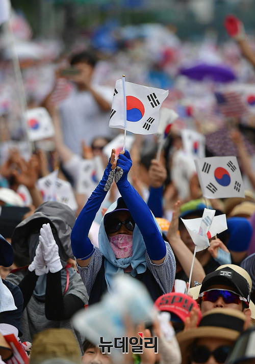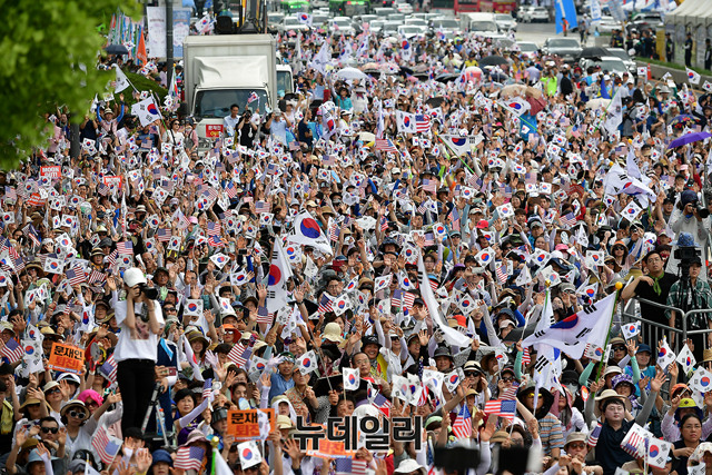 건국 70주년 기념식 및 8.15 국가해체세력 규탄 범국민대회에 참석한 참가자들이 15일 오후 광화문광장에서 태극기와 성조기를 흔들고 있다.