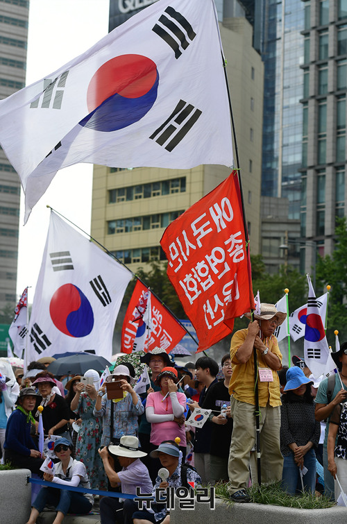 건국 70주년 기념식 및 8.15 국가해체세력 규탄 범국민대회 참가자들이 15일 오후 광화문광장에서 태극기를 들고 국민의례를 하고 있다.