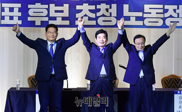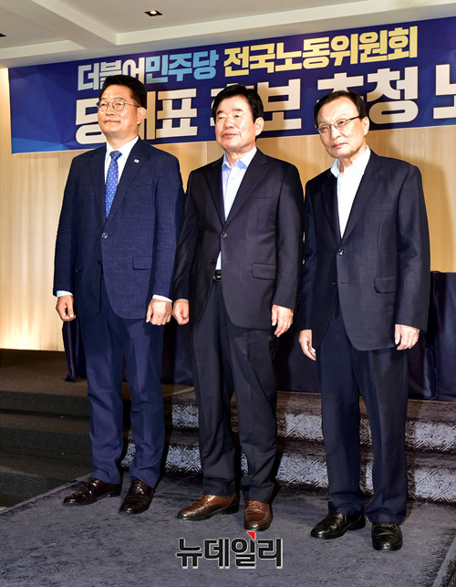 송영길, 김진표, 이해찬(왼쪽부터) 더불어민주당 당대표 후보가 15일 오후 서울 여의도 한국노총 대강당에서 열린 노동정책 토론회에 앞서 기념촬영을 하고 있다.