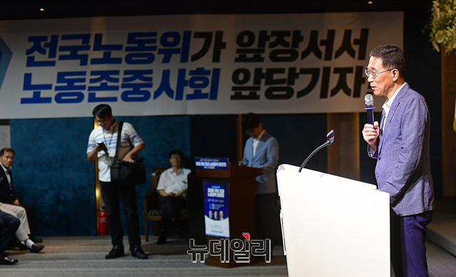 김주영 한국노총위원장이 15일 오후 서울 여의도 한국노총 대강당에서 열린 노동정책 토론회에 앞서 인사말을 하고 있다.