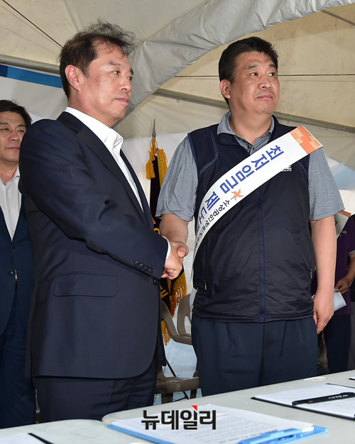 김병준 자유한국당 혁신비상대책위원장이 16일 오후 서울 광화문사거리 인근에 마련된 소상공인119민원센터 천막에서 '영세소상공인 살리기 현장의견 청취' 행사에 앞서 최승재 소상공인연합회장과 악수를 나누고 있다.