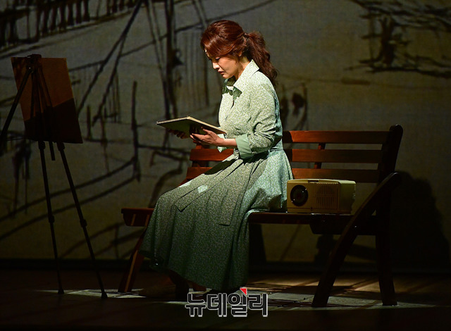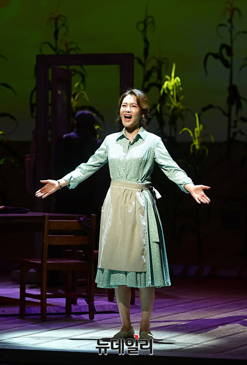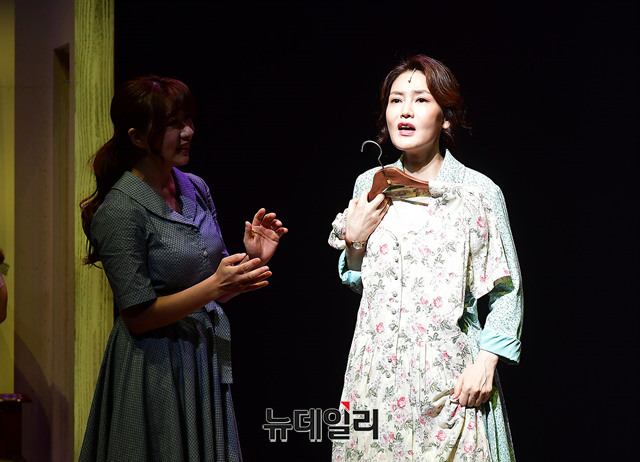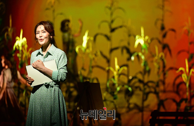 배우 김선영이 16일 오후 서울 송파구 샤롯데씨어터에서 열린 뮤지컬 '매디슨 카운티의 다리' 프레스콜에서 하이라이트 장면을 시연하고 있다.