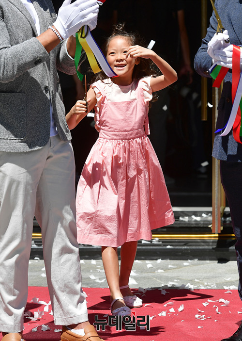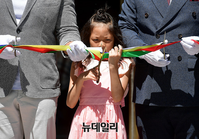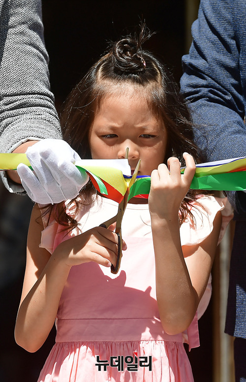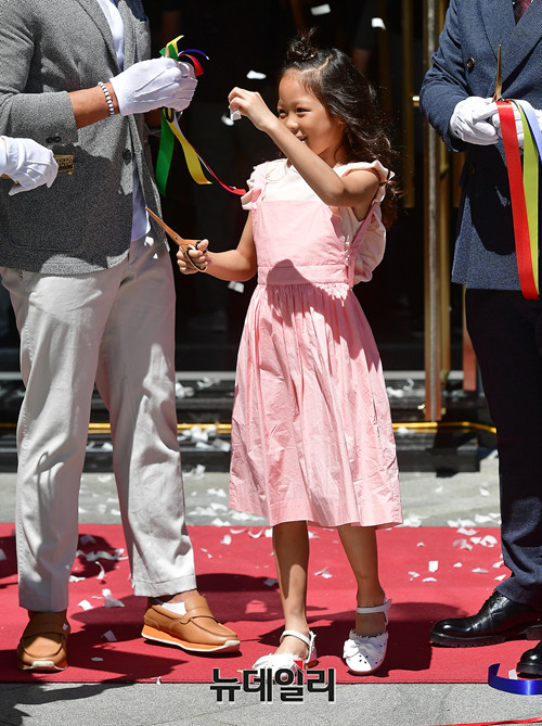 바디프랜드 광고모델로 활동하고 있는 추사랑이 17일 정오 서울 종로구 바디프랜드 광화문 직영전시장 오픈 행사에서 테이프 커팅식에 참석하고 있다. 이날 오픈행사에는 추성훈, 추사랑 부녀가 참석해 팬사인회를 통해 팬들을 만났다.