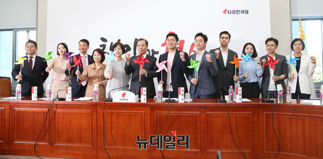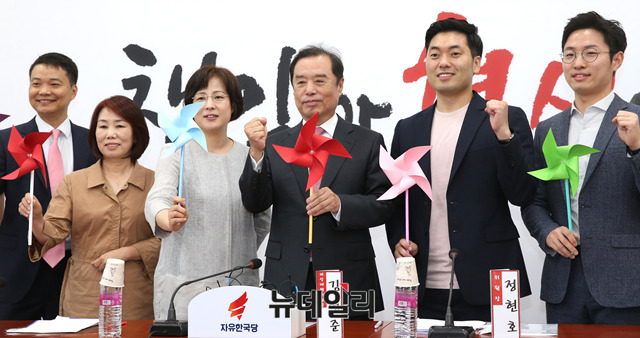 김병준 자유한국당 비대위원장이 17일 오후 국회에서 열린 여성청년특별위원회 1차 회의에 앞서 바람개비를 들고 파이팅을 외치고 있다.