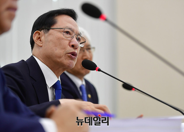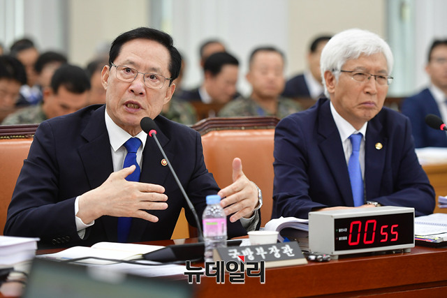 송영무 국방부 장관이 21일 오전 국회 국방위원회 회의에 참석해 질문에 답하고 있다.