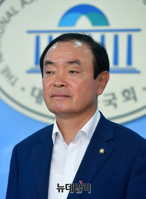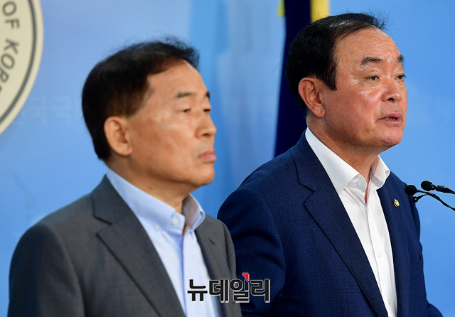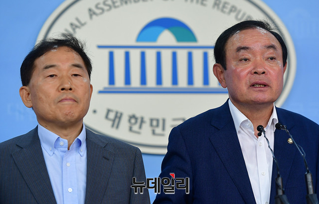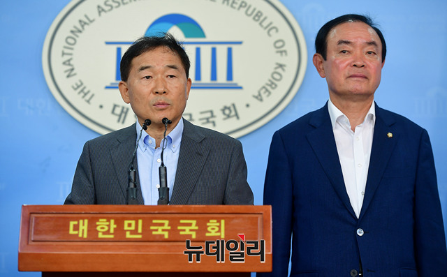 장병완 민주평화당 원내대표와 황주홍 의원이 21일 오후 국회 정론관에서 기자회견을 열고 상임위원회 결산 예비심사권을 침해한 국회의장의 사과를 촉구하고 있다.