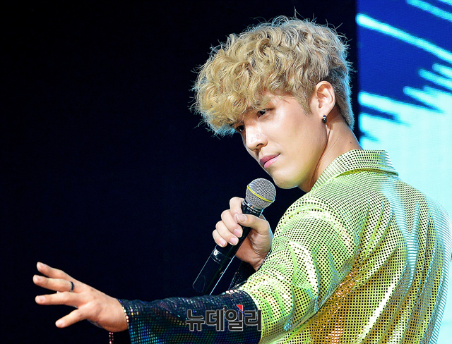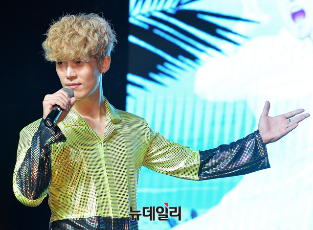 가수 노라조(Norazo : 조빈, 원흠) 원흠이 21일 오후 서울 마포구 하나투어 브이홀에서 열린 신곡 '사이다(CIDER)' 발매 기념 쇼케이스에 참석해 포즈를 취하고 있다.