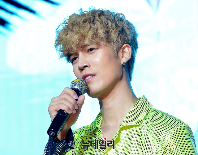 가수 노라조(Norazo : 조빈, 원흠) 원흠이 21일 오후 서울 마포구 하나투어 브이홀에서 열린 신곡 '사이다(CIDER)' 발매 기념 쇼케이스에 참석해 질문에 답하고 있다.