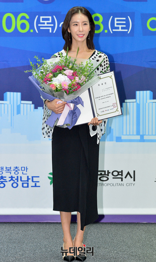 배우 한은정이 24일 오전 서울 강남구 코엑스에서 열린 '2018 충청권 중소벤처기업 박람회' 홍보대사 위촉식에 참석해 기념촬영을 하고 있다.