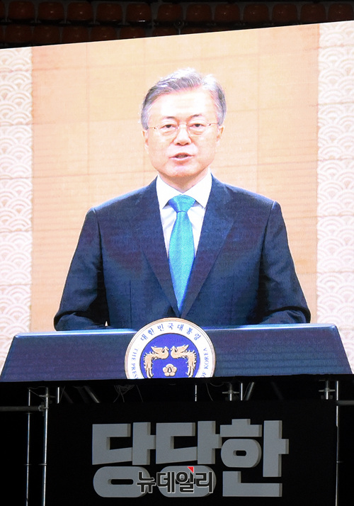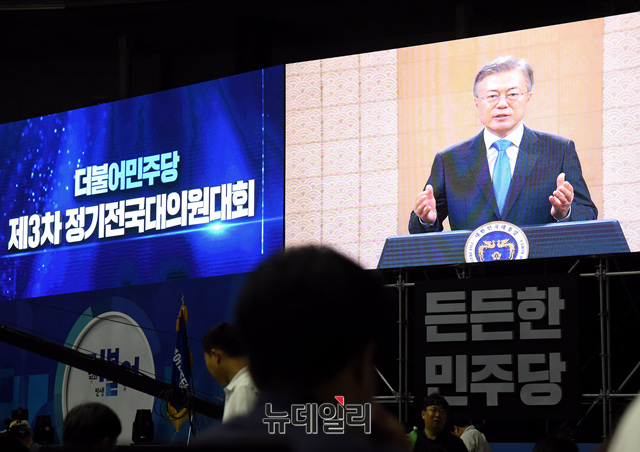 문재인 대통령이 25일 오후 서울 송파구 올림픽공원 체조경기장에서 열린 '더불어민주당 제3차 전당대회'에 축하 영상 메세지를 보냈다.
