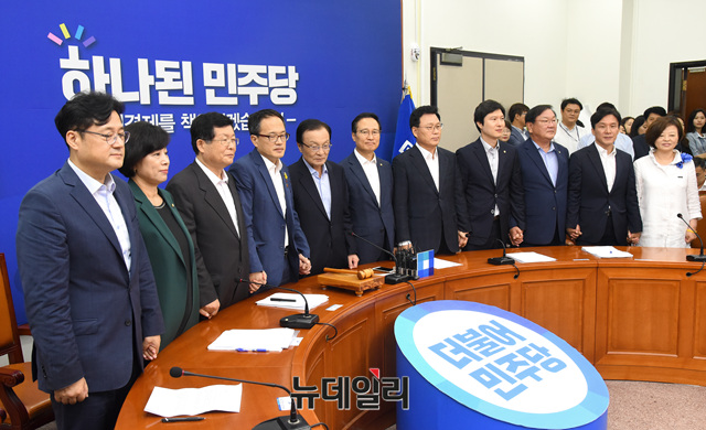 이해찬 더불어민주당 신임 대표와 홍영표 원내대표, 신임 최고위원들이 27일 오전 국회에서 열린 최고위원회의에 참석해 인사를 하고 있다.