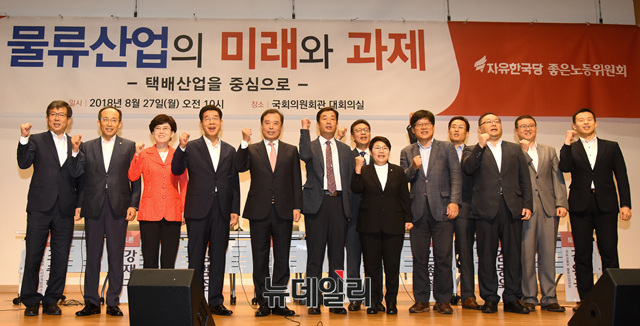 김병준 자유한국당 비상대책위원장이 27일 오전 국회 의원회관에서 열린 '물류산업의 미래와 과제 : 택배산업을 중심으로' 토론회에 참석해 화이팅을 외치고 있다.
