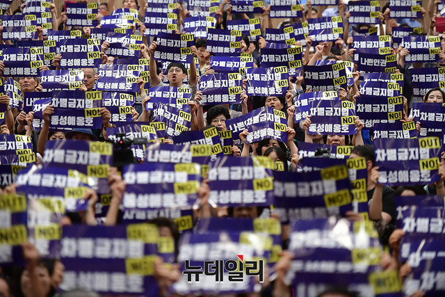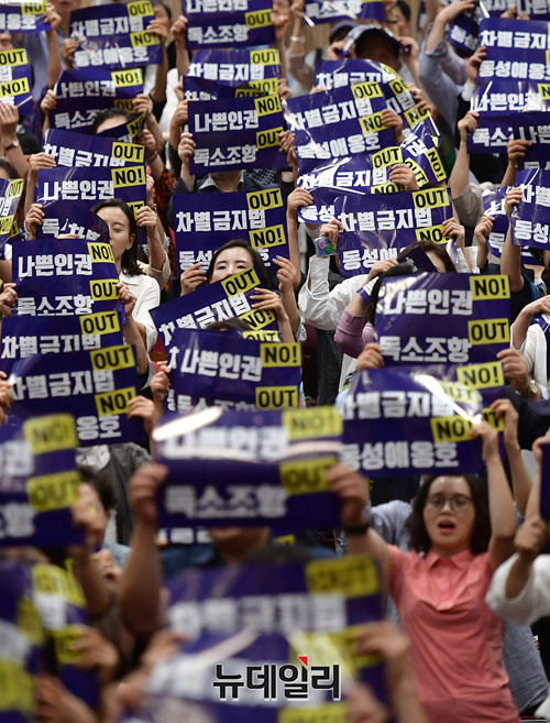 국민기만 인권정책 비상대책위원회 출범식 참가자들이 27일 오후 국회의원회관 대회의실에서 열린 출범식에서 '차별금지법 OUT, 동성애옹호 NO'라고 적힌 손피켓을 들고 구호를 외치고 있다.이들은 출범취지문을 통해 "편향적이고 국민기만적인 국가인권정책기본계획(NAP)을 공표한 정부의 잘못된 인권정책을 바로 잡기 위해 모였다"며 "인권정책에서 문제되는 독소조항을 삭제해달라고 요청했지만 받아들여지지 않아, 뜻을 같이하는 각계 단체들과 국민들이 연합해 '국민기만 인권정책 비상대책위원회(국인위)'를 창립하게 됐다"고 밝혔다.