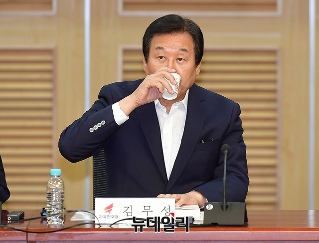 김무성 자유한국당 의원이 27일 오후 국회 의원회관에서 '길 잃은 보수정치, 공화주의에 주목한다'를 주제로 열린 토론회에 참석해 물을 마시고 있다.