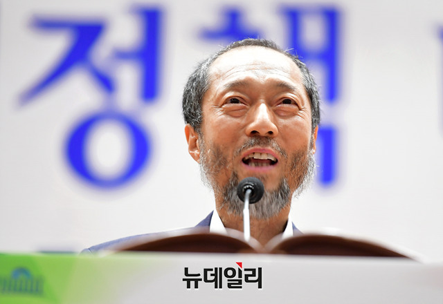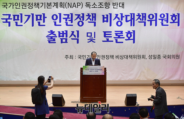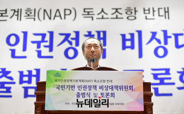 길원평 동성애동성혼반국민연합 운영위원장이 27일 오후 국회의원회관 대회의실에서 열린 '국가인권정책기본계획(NAP) 독소조항 반대, 국민기만 인권정책 비상대책위 출범식 및 토론회'에서 출범 취지문을 밝히고 있다.이날 출범한 비대위는 출범취지문을 통해 "편향적이고 국민기만적인 국가인권정책기본계획(NAP)을 공표한 정부의 잘못된 인권정책을 바로 잡기 위해 모였다"며 "인권정책에서 문제되는 독소조항을 삭제해달라고 요청했지만 받아들여지지 않아, 뜻을 같이하는 각계 단체들과 국민들이 연합해 '국민기만 인권정책 비상대책위원회(국인위)'를 창립하게 됐다"고 창립 취지를 밝혔다.또 "NAP는 포괄적 차별금지법의 제정, 성평등의 실현, 동성애·동성혼의 추진, 병역거부와 대체복무제의 도입 등 많은 악법 소지를 담고 있다"고 주장했다.