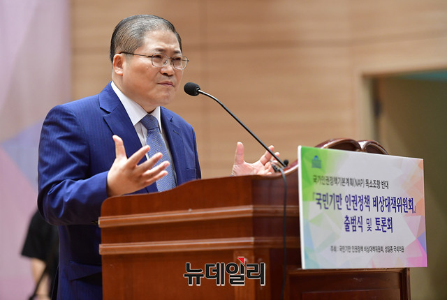 소강석 한국교회공동정책연대 상임회장이 27일 오후 국회의원회관 대회의실에서 열린 '국가인권정책기본계획(NAP) 독소조항 반대, 국민기만 인권정책 비상대책위 출범식 및 토론회'에서 출범 메시지를 전하고 있다.이날 출범한 비대위는 출범취지문을 통해 "편향적이고 국민기만적인 국가인권정책기본계획(NAP)을 공표한 정부의 잘못된 인권정책을 바로 잡기 위해 모였다"며 "인권정책에서 문제되는 독소조항을 삭제해달라고 요청했지만 받아들여지지 않아, 뜻을 같이하는 각계 단체들과 국민들이 연합해 '국민기만 인권정책 비상대책위원회(국인위)'를 창립하게 됐다"고 창립 취지를 밝혔다.또 "NAP는 포괄적 차별금지법의 제정, 성평등의 실현, 동성애·동성혼의 추진, 병역거부와 대체복무제의 도입 등 많은 악법 소지를 담고 있다"고 주장했다.