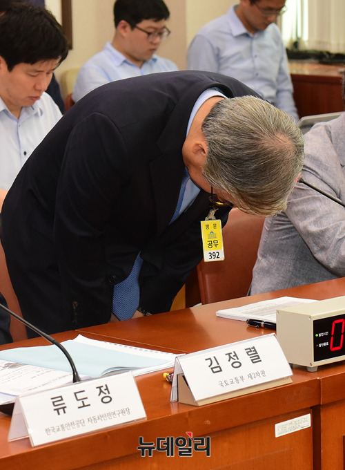 김효준 BMW코리아 대표이사가 28일 오전 국회 국토교통위원회에서 열린 BMW 차량 화재 관련 공청회에서 고개 숙여 사과하고 있다.