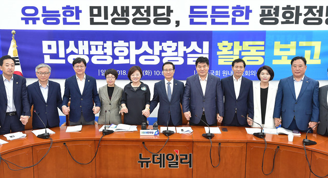 홍영표 더불어민주당 원내대표 등 참석자들이 28일 오전 국회에서 열린 민생평화상황실 해단식에서 기념사진을 촬영하고 있다.
