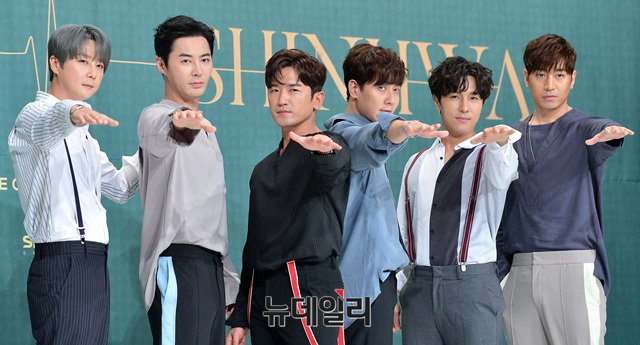 그룹 신화(SHINHWA : 에릭, 이민우, 김동완, 신혜성, 전진, 앤디)가 28일 오후 서울 영등포구 타임스퀘어에서 열린 데뷔 20주년 스페셜 앨범 '하트(HEART)' 발매 기념 기자간담회에참석해 포즈를 취하고 있다.'하트'는 신화 특유의 감성을 바탕으로 지금까지 한 번도 선보이지 않았던 장르까지 모두 담았다. 타이틀곡 '키스 미 라이크 댓(Kiss Me Like That)'을 포함 총 6곡이 수록됐다. 음원은 오늘(28일) 오후 6시 공개된다.