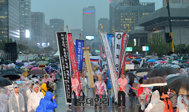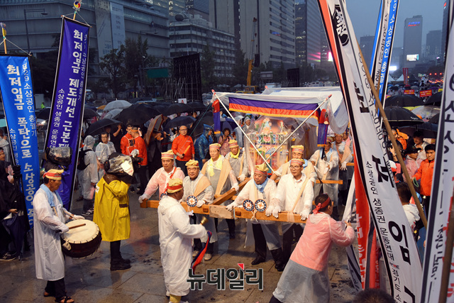 '최저임금 제도개선 촉구 대규모 총궐기 국민대회'가 열린 29일 오후 서울 광화문광장에 최저임금 제도개선 촉구 의미를 담은 만장과 상여가 비를 맞으며 들어서고 있다.
