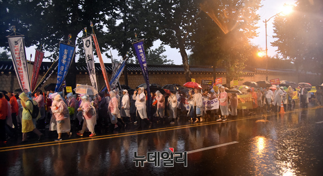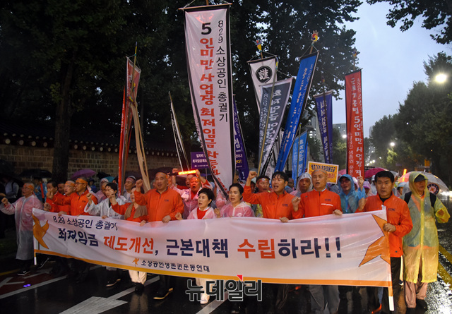 소상공인연합회가 29일 오후 서울 광화문광장에서 '최저임금 제도개선 촉구 대규모 총궐기 국민대회' 후 비를 맞으며 청와대로 행진하고 있다.