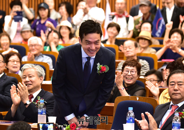 김세의 가로세로연구소 대표가 30일 오전 국회 헌정기념관에서 열린 '대한애국당 창당 1주년 기념식'에서 참석자들에게 인사를 하고 있다.