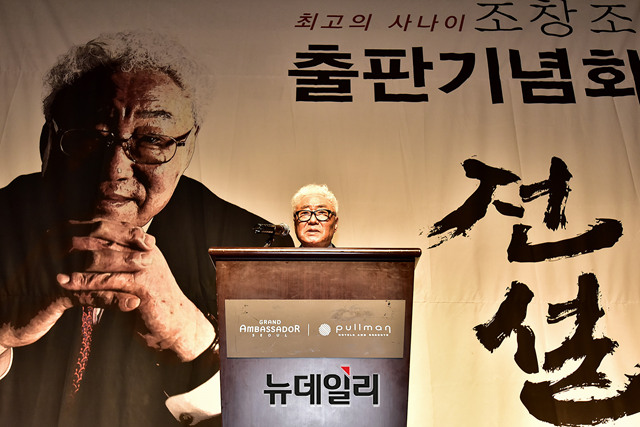 주먹계 대부 조창조 씨가 30일 오후 서울 중구 그랜드 앰배서더 서울 풀만 호텔에서 열린 본인의 출판기념회에서 인사말을 하고 있다. 조 씨는 주먹세계에 등장한 이후 한 번도 패배하지 않은 불패신화의 주인공으로 알려져 있다.