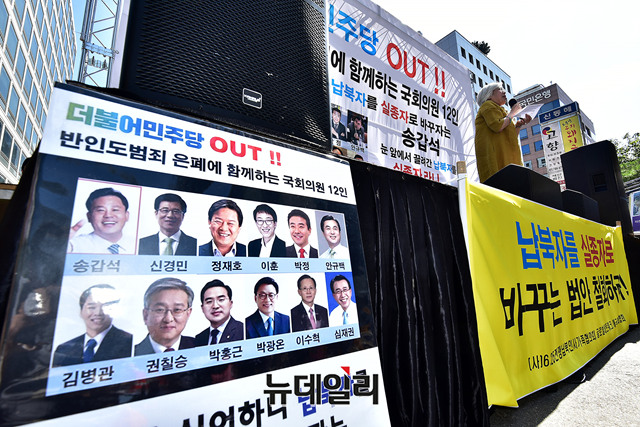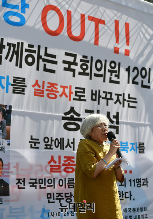 이미일 6.25전쟁납북인사가족협의회 이사장이 31일 오후 서울 여의도 더불어민주당 당사 앞에서 열린 민주당 규탄 2차 대회에서 인사말을 하고 있다.6.25전쟁납북인사가족협의회, 애국문화협회, 북한자유글로벌네트워크의 공동주최로 열린 2차 대회는 송갑석(광주서구갑) 더불어민주당 의원이 발의한 '납북자'를 '실종자'로 바꾸는 법안에 항의하며 지난 24일 집회에 이어 2차 집회를 이어갔다.이들은 송 의원과 공동발의자 12명에 대해 법안 철회시까지 지역구 사무실 등에 항의방문을 이어나갈 것이며 전시납북피해자와 가족들의 명예회복을 위해 끝까지 노력할 것이라고 밝혔다.