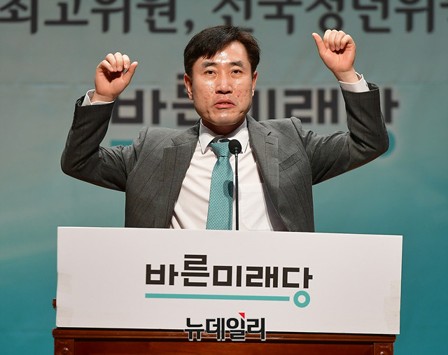 하태경 바른미래당 당대표 후보가 2일 오후 국회 의원회관에서 열린 바른미래당 전당대회에서 인사말을 하고 있다.