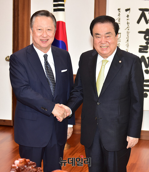 문희상 국회의장이 4일 오전 국회 의장실에서 예방한 박용만 대한상공회의소 회장과 악수를 나누고 있다. 이날 박 회장은 규제개혁 법안 통과 촉구를 위해 국회를 찾았다.