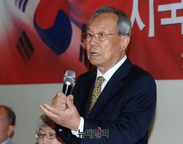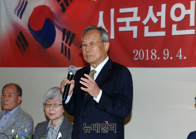 박관용 전 국회의장이 4일 오전 서울 중구 달개비에서 열린 대한민국수호 비상국민회의 '시국선언 기자회견'에 참석해 인사말을 하고 있다.
