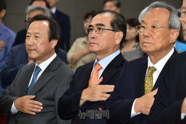 '한반도 인권과 통일을 위한 변호사 모임' 주관 제1회 북한인권상 수상자로 선정된 태영호 전 영국 주재 북한공사가 4일 오후 국회 의원회관에서 열린 '제1회 북한인권상 시상식'에서 국민의례를 하고 있다. (왼쪽부터 홍일표 자유한국당 의원, 태 전 공사, 박관용 전 국회의장)