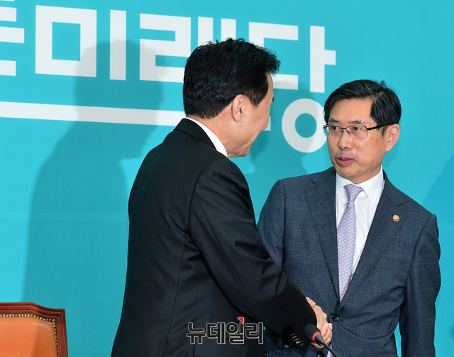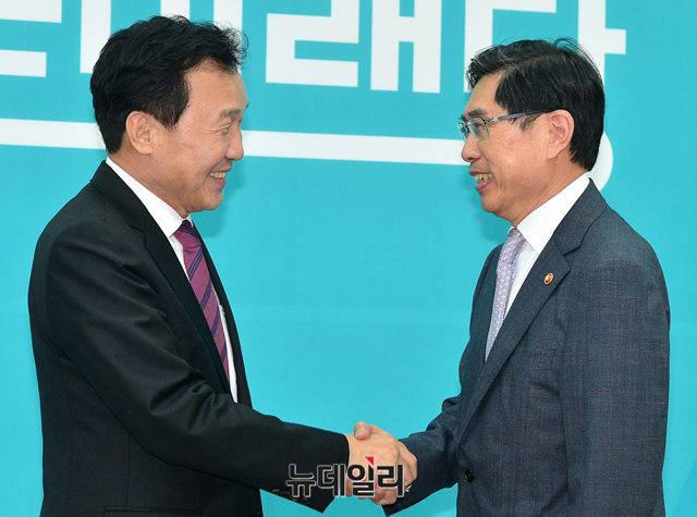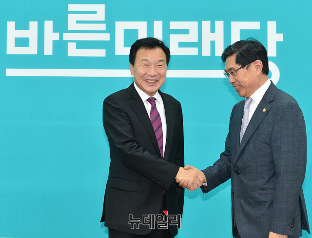 박상기 법무부 장관이 5일 오전 국회에서 손학규 바른미래당 신임 대표를 예방해 악수를 나누고 있다.