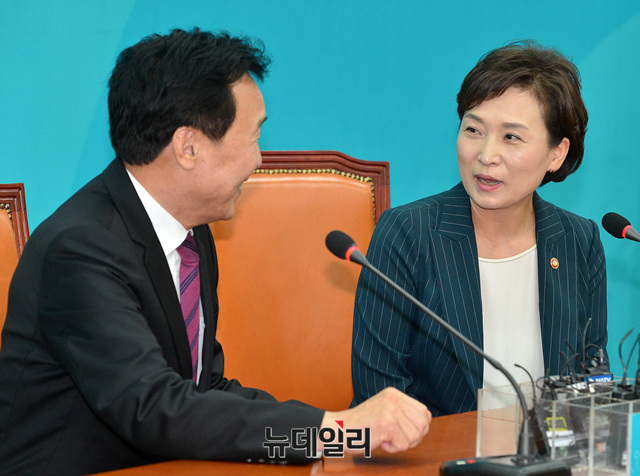 김현미 국토교통부 장관이 5일 오전 국회에서 손학규 바른미래당 신임 대표를 예방해 대화를 나누고 있다.