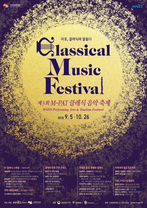 클래식 선율이 마포구의 가을 하늘을 수놓는다.마포구(구청장 유동균)와 마포문화재단(이사장 손숙·대표이사 이창기, 이하 재단)은 9월 5일부터 10월 26일까지 50일간 6개 테마로 70회, 500여 명의 아티스트가 출연하는 '제3회 M-PAT 클래식음악축제'를 개최한다.'M-PAT(엠팻)'은 'Mapo Performing Arts & Tourism'의 줄임말이다. 마포구는 그동안 렛츠락페스티벌, 프린지페스티벌, 상암 DMC페스티벌 등 다양한 축제를 이어왔다. 재단은 외래관광객 160만 시대를 맞아 문화관광 자원이 풍부한 지역의 특성을 살려 글로벌 축제로 키워 나갈 계획이다.'도시, 클래식에 물들다'라는 콘셉트로 펼쳐지는 'M-PAT 클래식음악축제'는 지난해 공원, 학교, 시장, 교회 등 다양한 일상 공간에서 무료로 열어 5만여 시민의 큰 호응을 얻었다. 올해는 버스킹, 게릴라콘서트, 실황 상영 등 대중에게 더 가까이 다가가며, 내외국인 관광객도 함께 즐길 수 있는 축제로 프로그램을 구성했다.