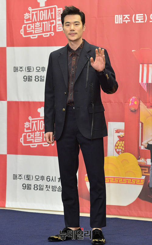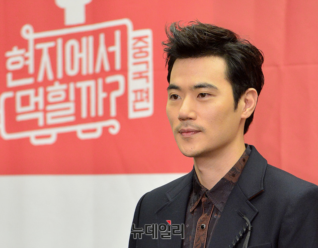 배우 김강우가 5일 오후 서울 마포구 스탠포드호텔에서 열린 예능 프로그램 '현지에서먹힐까? 중국편' 제작발표회에 참석해 포즈를 취하고 있다.