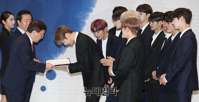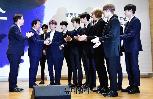 그룹 워너원(강다니엘, 박지훈, 이대휘, 김재환, 옹성우, 박우진, 라이관린, 윤지성, 황민현, 배진영, 하성운)이 5일 오후 국회 의원회관에서 열린 '2018 국가브랜드 컨퍼런스'에 참석해 문화 부문 국가브랜드대상을 수상하고 있다.