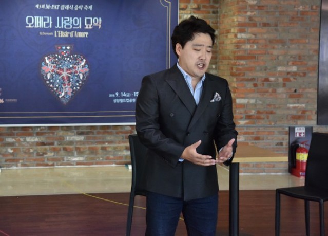 "야외오페라는 사실 피하고 싶은 것 중 하나에요. 날씨, 관객, 빛 등 변수가 너무 많아요. 보통 극장의 무대에서 쉽게 통제되는 것들이 야외에서는 불가능하거든요. 자연에 맡겨야 해요. 그게 단점이지만 동시에 멋이죠. 맑은 날씨가 찾아와주길 기도하고 있어요."테너 김건우(33)는 5일 오후 서울 마포아트센터에서 열린 오페라 '사랑의 묘약' 프레스콜에서 기자를 만나 "오랜만에 서는 고국 무대라 더 신경이 쓰여요. 열심히 준비해서 좋은 공연을 보여주겠습니다"라며 기대감을 내비쳤다.'M-PAT(엠팻) 클래식 음악축제'의 백미로 꼽히는 야외오페라 '사랑의 묘약(L'elisir d'amore)'이 오는 14~15일 상암월드컵공원 내 수변무대에 오른다.이탈리아 음악가 도니체티의 오페라 '사랑의 묘약'은 극중 등장하는 아리아 '남 몰래 흐르는 눈물'로 유명한 작품이다. 농장주의 딸 아디나를 조건 없이 사랑하는 지고지순한 농부 네모리노가 우여곡절 끝에 아디나의 마음을 얻는 과정을 그린다.