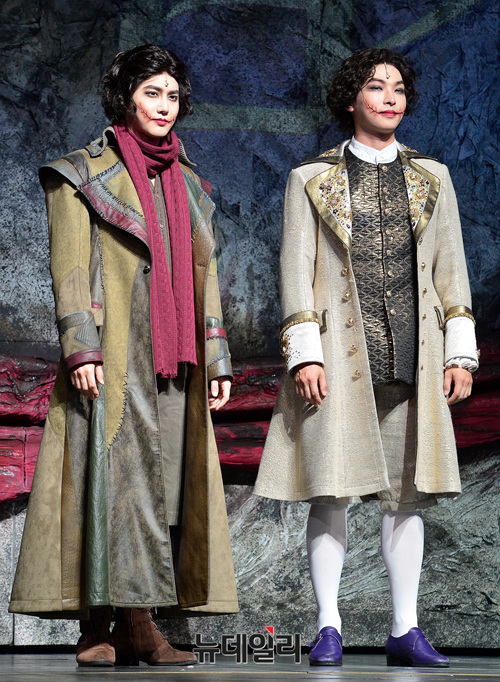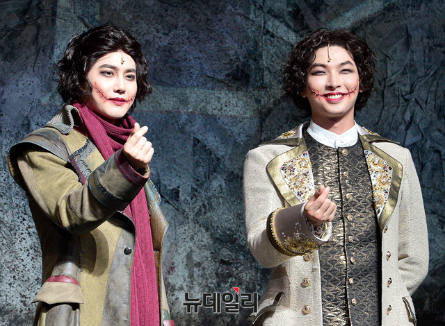 엑소 수호와 배우 박강현이 7일 오후 서울 용산구 블루스퀘어에서 열린 뮤지컬 '웃는남자' 프레스콜에 참석해 포토타임을 갖고 있다. 수호와 박강현은 괴물 얼굴을 한 그윈플렌 역을 맡았다.