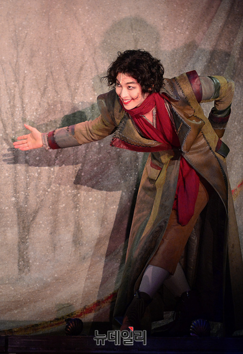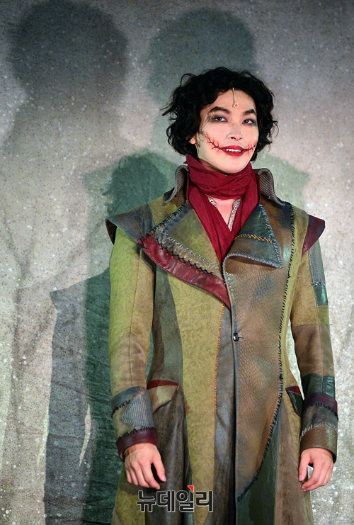 배우 박강현이 7일 오후 서울 용산구 블루스퀘어에서 열린 뮤지컬 '웃는남자' 프레스콜에 참석해 하이라이트 장면을 시연하고 있다. 박강현은 끔찍한 괴물 얼굴을 한 그윈플렌 역을 맡았다.