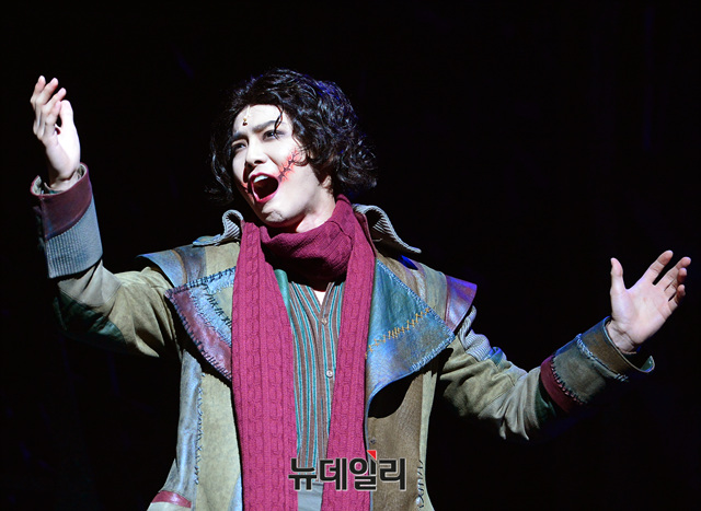 엑소 수호가 7일 오후 서울 용산구 블루스퀘어에서 열린 뮤지컬 '웃는남자' 프레스콜에 참석해 하이라이트 장면을 시연하고 있다. 수호는 끔찍한 괴물 얼굴을 한 그윈플렌 역을 맡았다.