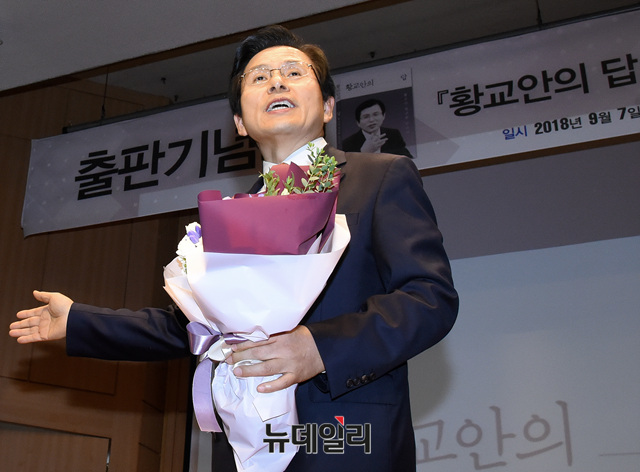 황교안 전 국무총리가 7일 오후 서울 서초구 매헌 윤봉길 의사기념관에서 열린 '황교안의 답(청년을만나다)' 출판기념회에 참석해 꽃다발을 전달받고 있다.