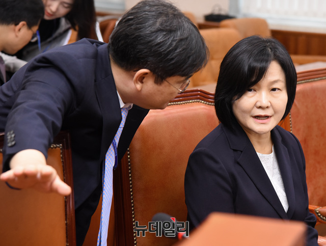 이은애 헌법재판관 후보자가 11일 오전 국회에서 열린 국회 법제사법위원회 인사청문회에 참석해 대화를 나누고 있다.