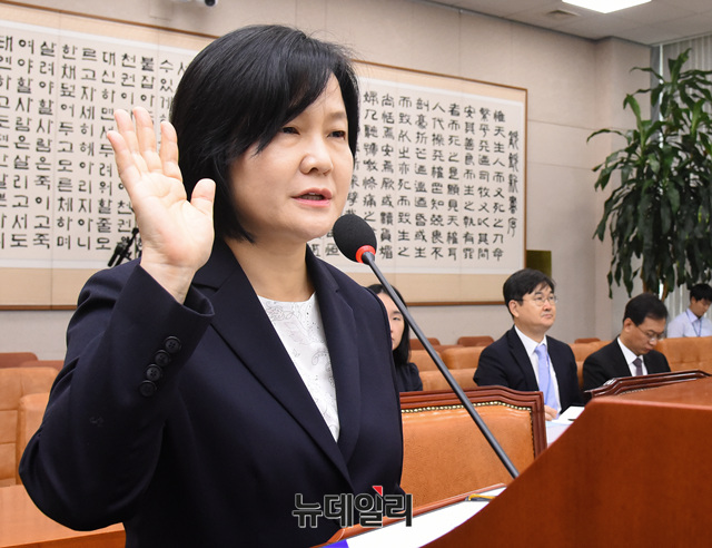 이은애 헌법재판관 후보자가 11일 오전 국회에서 열린 국회 법제사법위원회 인사청문회에 참석해 선서를 하고 있다.