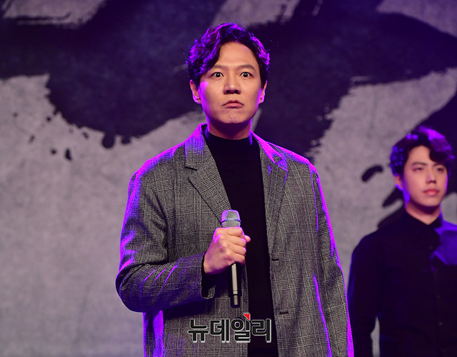 뮤지컬 배우 고영빈이 11일 오전 서울 중구 더플라자호텔에서 열린 뮤지컬 1446 제작발표회에서 하이라이트 장면을 시연하고 있다. 세종대왕의 일대기를 그린 뮤지컬 1446은 오는 10월 5일부터 12월 2일까지 국립중앙박물관 극장용에서 공연된다.