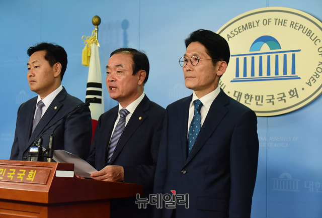 김관영 바른미래당, 장병완 민주평화당,윤소하 정의당 원내대표가 11일 오후 국회 정론관에서 정치개혁특별위원회의 정상화를 촉구하는 기자회견을 하고 있다.