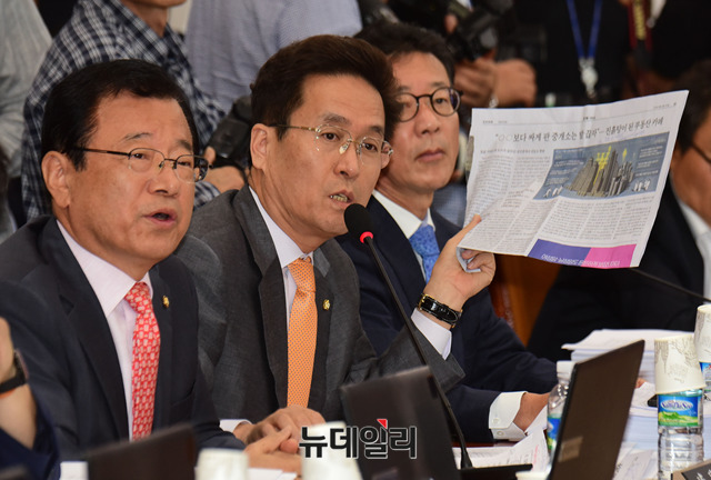함진규 자유한국당 의원이 12일 오전 국회에서 열린 국토교통위원회 전체회의에서 의사진행 발언하고 있다.