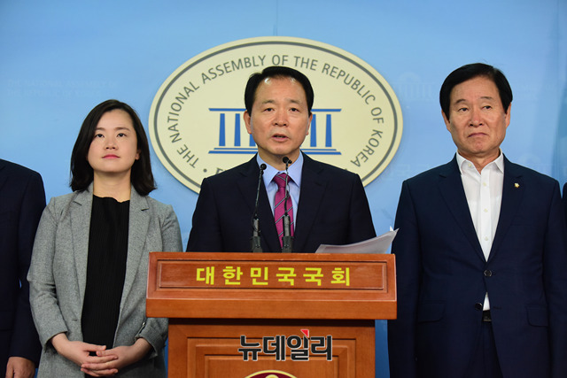 자유한국당 소상공인특별위원회 의원들이 12일 오전 국회 정론관에서 최승재 소상공인연합회장에 대한 검찰의 재수사 중지를 요구하는 기자회견을 하고 있다. (왼쪽부터 이은권, 김규환, 최교일, 신보라, 성일종, 곽대훈, 추경호)