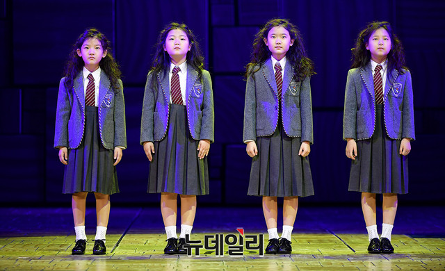 마틸다 역을 맡은 아역배우 황예영, 이지나, 안소명, 설가은이 12일 오후 서울 강남구 LG아트센터에서 열린 뮤지컬 '마틸다' 프레스콜에서 포토타임을 갖고 있다.작가 '로알드 달(Roald Dahl)'의 대표소설을 뮤지컬화 한 '마틸다'는 똑똑하고 책 읽기를 좋아하는 어린 소녀 마틸다가 부모와 학교의 부당함으로부터 벗어나 진정한 자아와 행복을 찾아가는 과정을 유쾌하고 따뜻하게 그려낸 작품.9월 8일부터 내년 2월 10일까지 LG아트센터에서 공연된다.